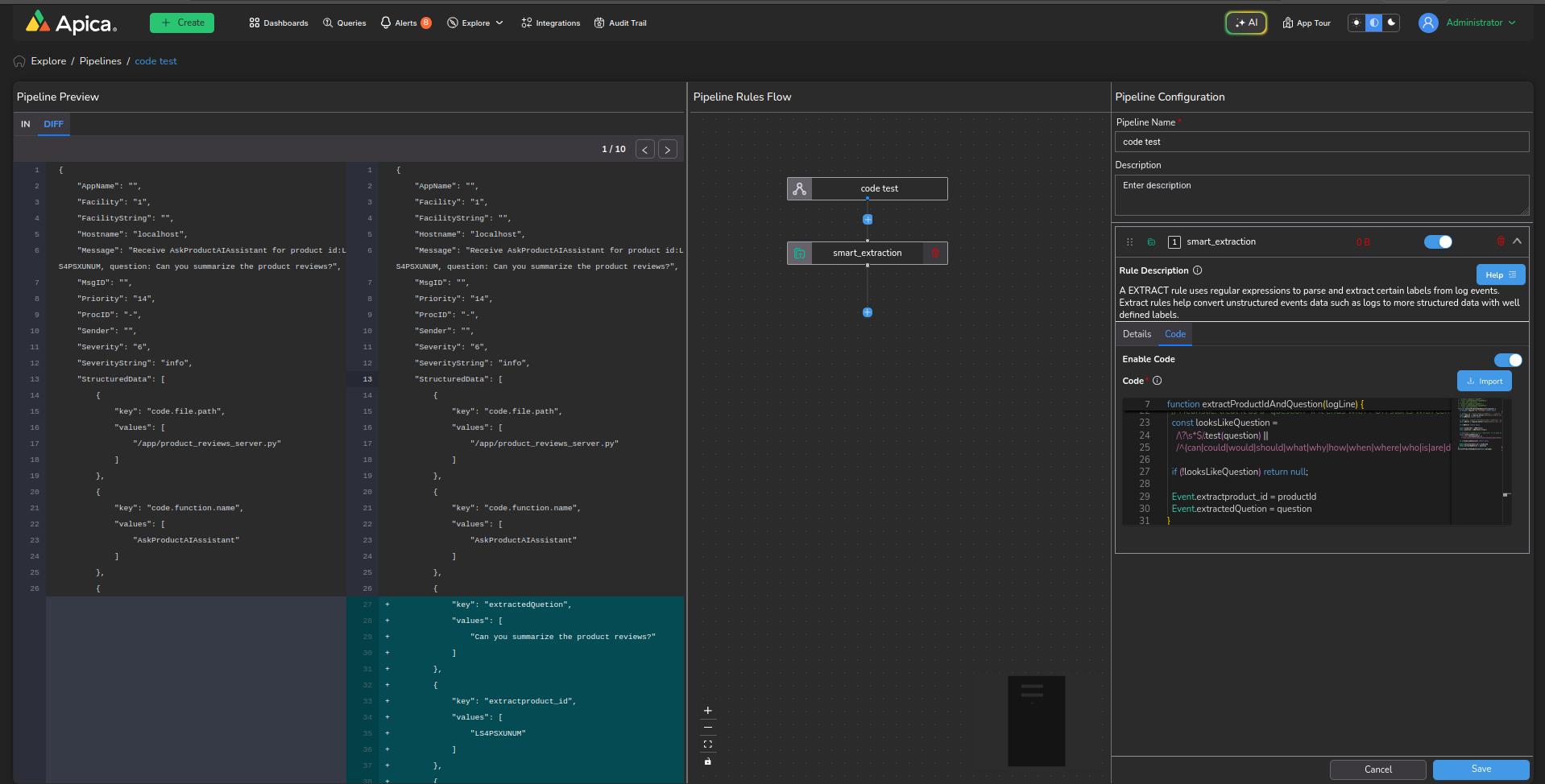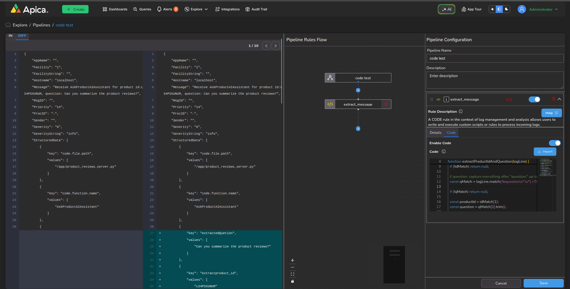 You can test code updates directly within the app with the `Diff` view in the `Pipeline Preview` section of the `Configure Pipeline` page. Simply provide a code snippet to update the log object, and instantly visualize the differences with our intuitive JSON compare view. Highlighted lines indicate changes, making it easy to review modifications at a glance. This feature not only streamlines the testing process but also empowers you to confidently manage updates to your log object.