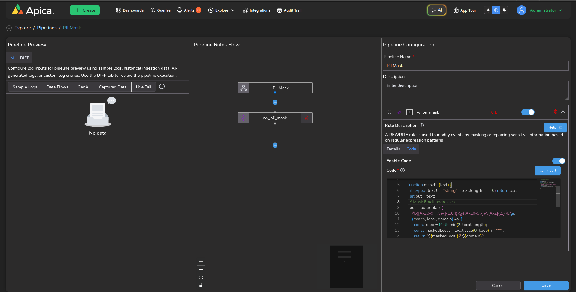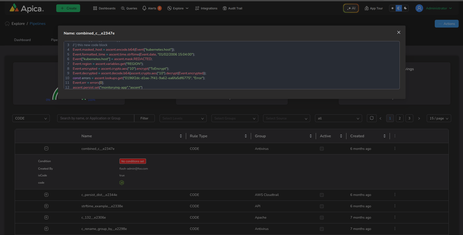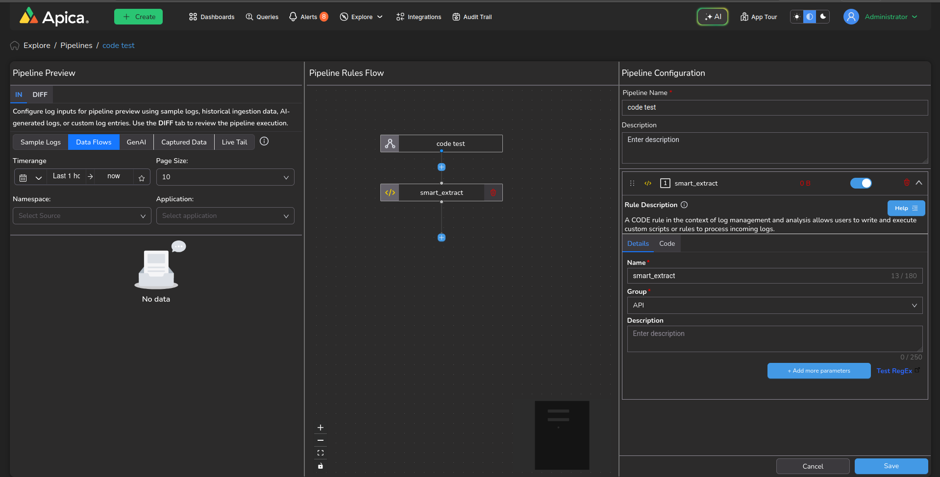 The Code Rule empowers users to create and execute custom scripts or rules for processing incoming logs. This flexibility allows for highly tailored log processing logic to be implemented, beyond what can be achieved with predefined rewrite or extraction rules. Users can leverage their programming skills to manipulate log data in sophisticated ways, enabling tasks such as complex data transformations, enrichment, filtering, or integration with external systems. This Rule offers advanced customization options for handling diverse log processing requirements.