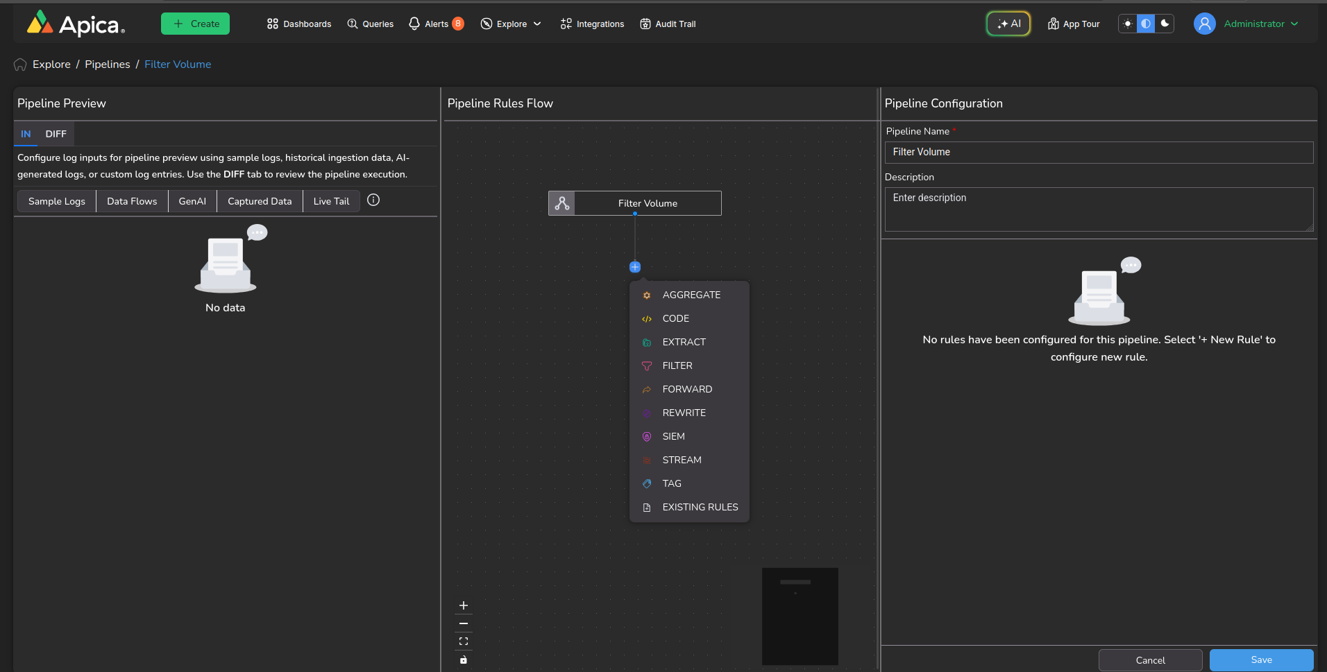 * Open the `Configure Pipeline` page of the desired pipeline. To know more about creating and editing pipelines, [click here](https://docs.apica.io/flow/pipeline-management/data-flow-pipelines-new).&#x20;
